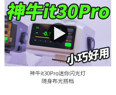 00:00:00神牛it30Pro迷你閃光燈,隨身布光搭檔如今很多相機為了輕量化,取消了機身閃光燈,為了滿足用戶需求,一些迷你閃光燈就應運而生了,比如我們這次在P&I現場看到的神牛it30Pro閃光燈