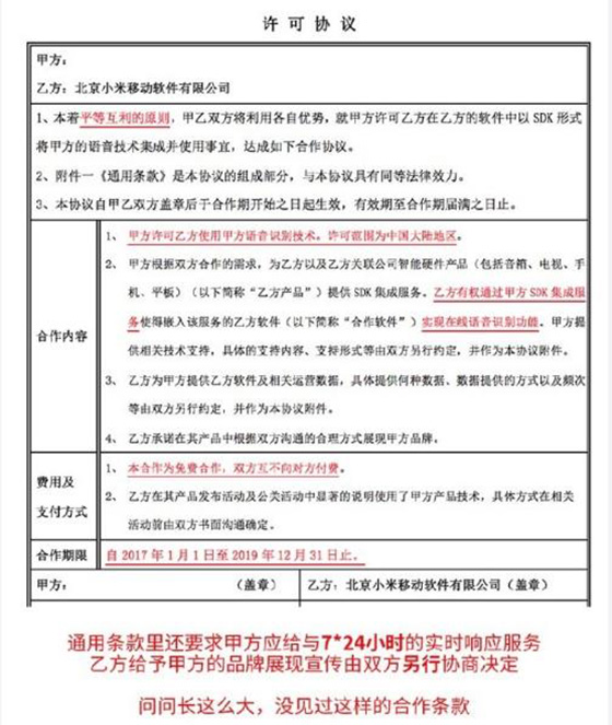 從出門問問給出的許可協議看,小米很強勢,只要稍微提一下人家的名字,就能免費使用對方的技術,且對方還得提供后續的技術支持,根本談不上什么平等互利。