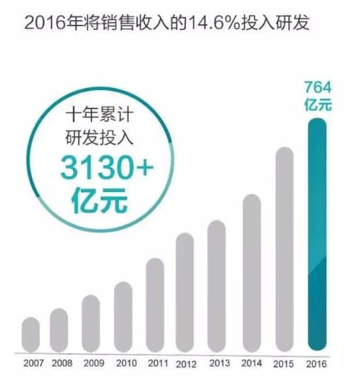 財報也揭示了華為之所以能夠打敗小米等廠商的秘密,那就是高投入的研發費用,10年累計突破3100多億,2016年的研發費用更是占銷售收入的14.6%,足夠高的。