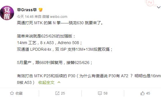 即使聯發科欲哭無淚處于弱勢,但是老對手高通依舊不依不饒,繼推出驍龍626/653處理器成功狙擊聯發科P10/P20之后,有網友草Grass草微博曝光了高通的另外一款處理器——驍龍630,用來打擊聯發科的P25/P30處理器的市場。