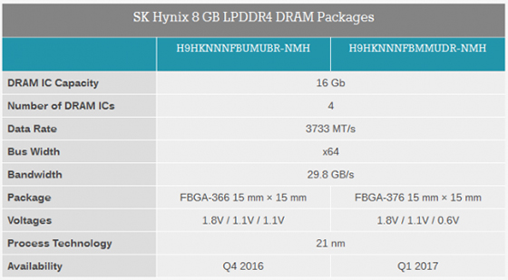 此后老對手SK海力士于12月宣布推出8GB LPDDR4內存與三星針鋒相對,與三星不同的是SK海力士的8GB LPDDR4內存將有366 ball與376 ball兩種規格。其中366 ball可以與SOC或是UFS疊在一起,現已開始出貨;376 ball將會在2017年第一季開始供應。SK海力士的16Gb內存使用的是21nm制程。