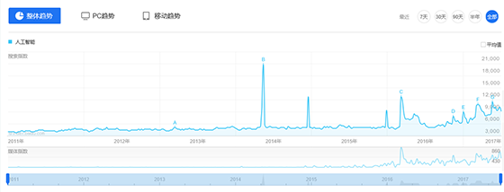 根據百度指數表明,人工智能近來勢頭越來越盛。去年“阿爾法狗”打敗李世石,今年升級歸來的“阿爾法狗”又完虐柯潔。每個事件都引爆觀眾的眼球。