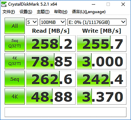 使用CrystalDiskMark測試下來可以看到,酷魚Pro的12TB硬盤的讀取速度為258.2MB/s,而寫入速度為255.7MB/s。