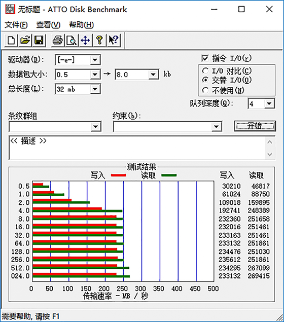 ATTO Disk Benchmark是一款簡單易用的磁盤傳輸速率檢測軟件,使用了不同大小的數據測試包, 數據包按0.5K,1.0K,2.0K直到到8192.0KB分別進行讀寫測試,測試完成后數據用柱狀圖的形式表達出來。能夠很好的說明文件大小比例不同時對磁盤讀取、寫入速度的影響。