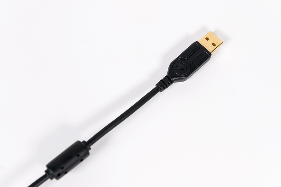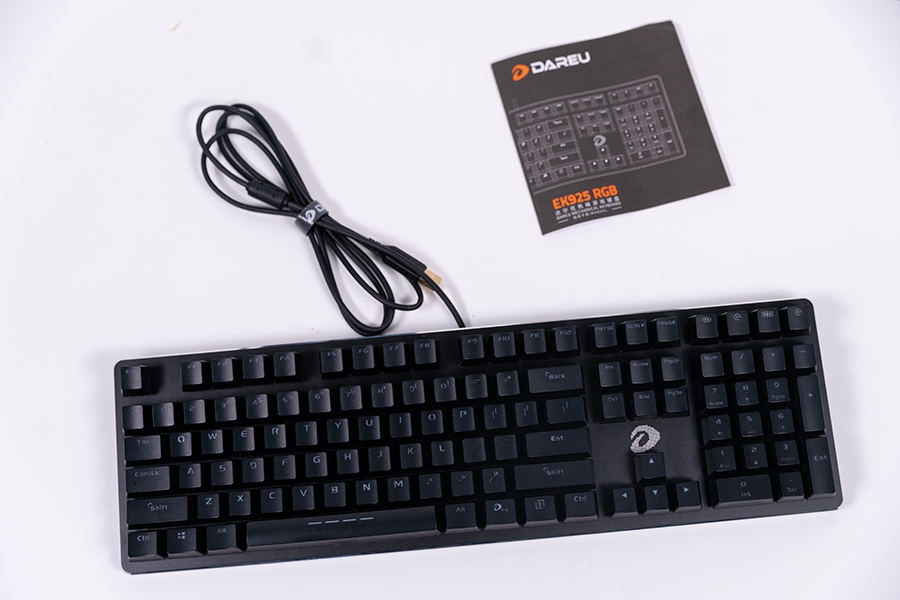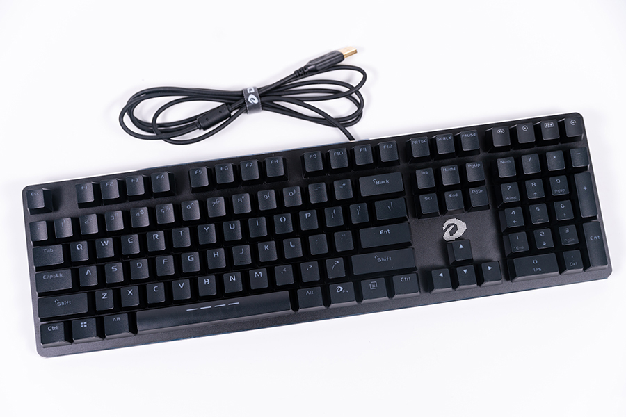 將目光焦點對準我們的產品主角,達爾優(yōu)EK925 RGB鍵盤采用了108鍵布局,為懸浮式設計,從平視角度看還能直接看到鍵盤的軸體,這樣的設計也有利于呈現(xiàn)出更好的透光效果。數(shù)據線與鍵盤連為一體,黑色橡膠材質,線長約為1.8m,線材配有抗干擾磁環(huán)和理線帶,USB接口為鍍金設計。