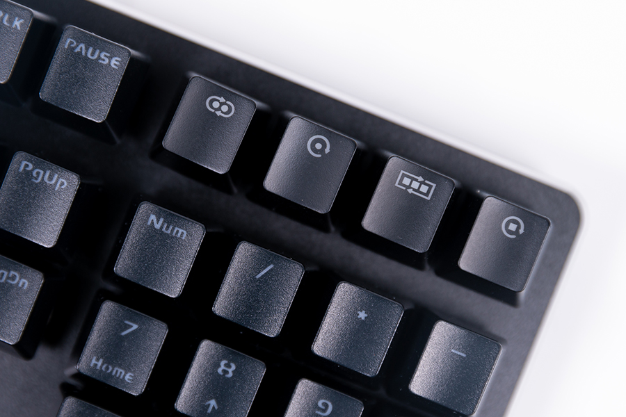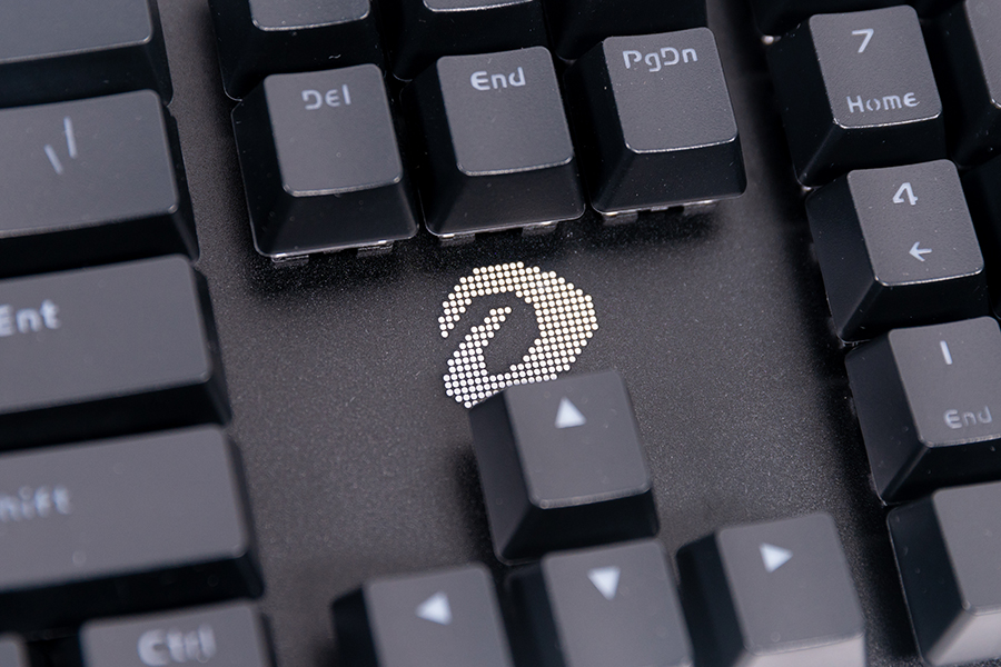 達爾優(yōu)的Logo顯眼的標記在了建爬上四個方向鍵的上方,同時還有一個小型達爾優(yōu)Logo位于問號鍵的下方,看到FN的標記就可以知道這是達爾優(yōu)的一個自定義按鍵了,那么這個自定義按鍵有什么作用呢?這就要我們將視線轉到鍵盤的右上角了。