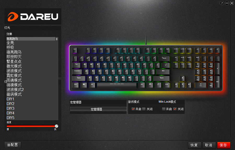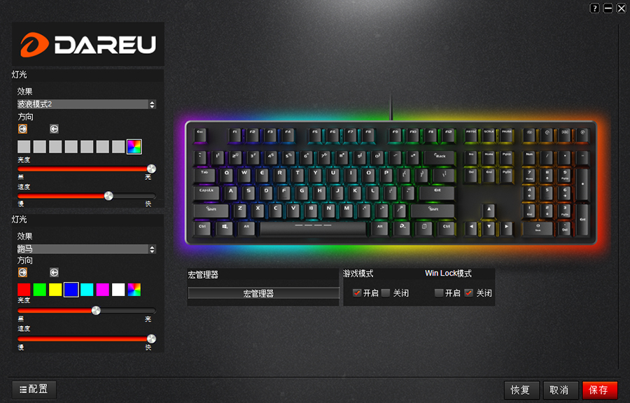 想要變化RGB燈效不僅可以通過組合鍵來實現(xiàn),這款達爾優(yōu)EK925RGB機械鍵盤還可在官網下載鍵盤的驅動支持,安裝驅動后自定義鍵盤的RGB光效變化,并且可以自定義調節(jié)宏鍵、組合鍵等功能,不過這個驅動界面稍顯簡陋,未來如果能更新一下驅動內容或許能開發(fā)出一些新玩法。