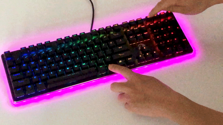 在鍵盤邊緣的下沿設有一圈透明燈帶導光層,由此處展現(xiàn)長方形的外圈RGB光效。