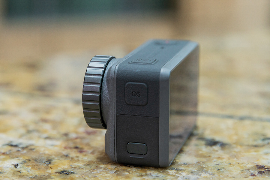 相較于Gopro Hero 7 Black(以下簡(jiǎn)稱(chēng)狗7),大疆的靈眸Osmo Action的體積稍稍更小一些,二者的鏡頭雖然都處于機(jī)身正面的右上角位置,Gopro Hero 7 Black是方形設(shè)計(jì),Osmo Action則是圓形結(jié)構(gòu),并且有一個(gè)可拆卸的保護(hù)鏡,未來(lái)會(huì)有相應(yīng)ND濾鏡配件在Osmo Action上得以使用。在鏡頭下方Osmo Action還多了一個(gè)散熱口。