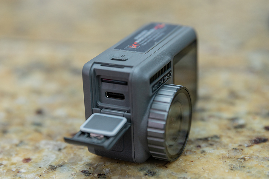 狗7只有開(kāi)關(guān)鍵和快門(mén)/錄制鍵兩個(gè)實(shí)體按鍵,而Osmo Action除了這兩個(gè)按鍵還新增一個(gè)位于機(jī)身側(cè)面的QuickSwitch按鍵,長(zhǎng)按實(shí)現(xiàn)前屏和后屏的顯示切換,短按可以調(diào)節(jié)拍攝參數(shù)。在QuickSwitch的下方則是Type-C接口與microSD卡槽。