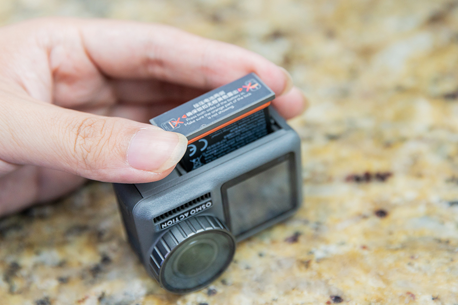 Osmo Action相機(jī)的底部是電池倉(cāng),電池和電池蓋采用了一體化的設(shè)計(jì),電池容量為1300mAh,由于一體化設(shè)計(jì),因而相比分離式的設(shè)計(jì)多了100mAh的電池容量。電池底部的四周包裹有密封橡膠,可有效避免進(jìn)水,按壓電池兩側(cè)的按鈕就能順利將電池取出。