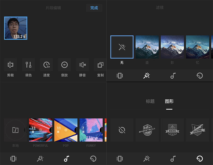 此外Dji Mimo還提供了視頻的剪輯功能,讓用戶能在移動(dòng)設(shè)備上直接為拍攝內(nèi)容進(jìn)行后期調(diào)節(jié),并且還為拍攝素材提供豐富的濾鏡調(diào)色,背景音樂(lè),標(biāo)題設(shè)置。如果是做常規(guī)的vlog視頻編輯,這款A(yù)PP的后期剪輯功能夠基本滿足用戶使用需求了。而Gopro的APP后期功能就沒(méi)這么齊全了,APP體驗(yàn)上也是Dji Mimo獲勝。