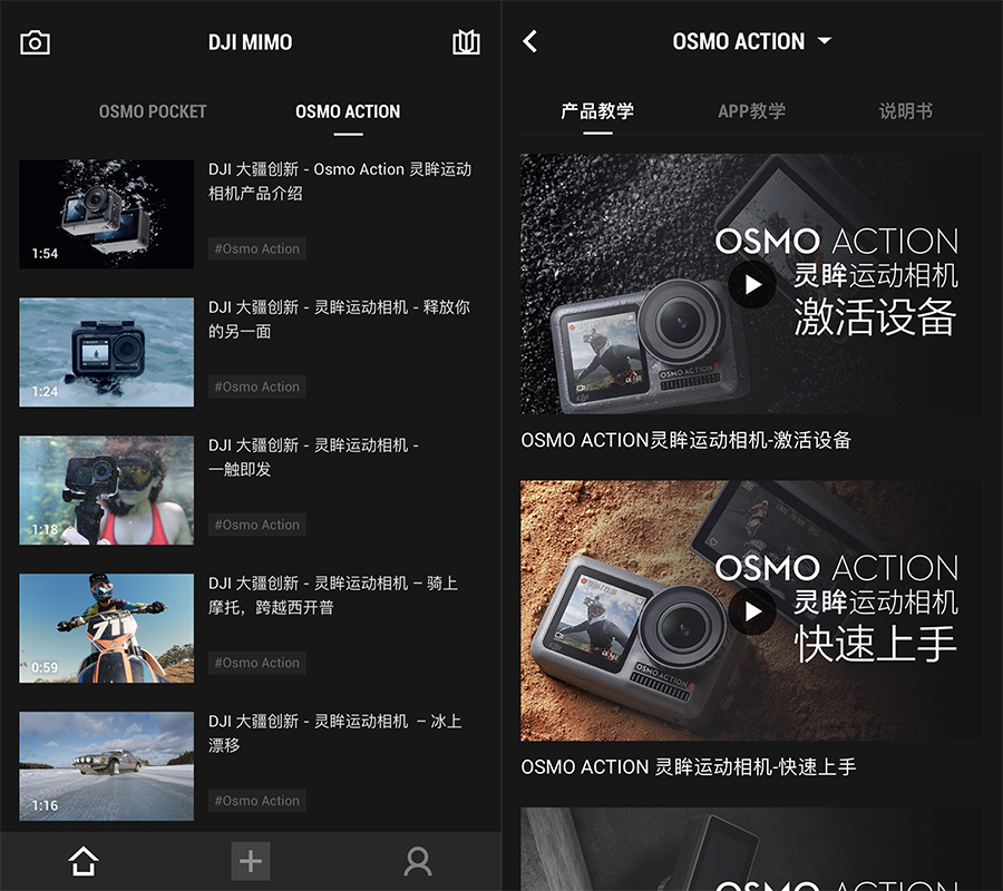 談完拍攝體驗(yàn),再來(lái)聊聊APP應(yīng)用,Osmo Action與Osmo Pocket一樣用的是Dji Mimo,相機(jī)上的所有功能在Dji Mimo中都有對(duì)應(yīng)的菜單,并且在APP內(nèi)還帶有Osmo Action的視頻教學(xué),比起難有動(dòng)力閱讀的說(shuō)明書(shū),視頻教學(xué)對(duì)于小白用戶的學(xué)習(xí)更加通俗易懂。