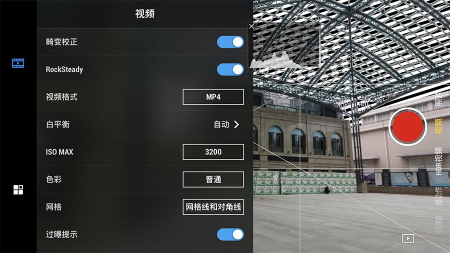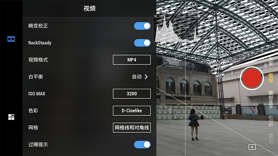 在拍攝操作的其它方面Osmo Action相比狗7也有許多改進(jìn)之處,比如相機(jī)背屏支持網(wǎng)格線對(duì)角線構(gòu)圖,直方圖以及斑馬線(過(guò)曝提示)的顯示,這些都是狗7沒(méi)有的,對(duì)專(zhuān)業(yè)攝影用戶來(lái)說(shuō)非常實(shí)用,常用的拍攝參數(shù)還能存入一個(gè)自定義設(shè)置,類(lèi)似于專(zhuān)業(yè)相機(jī)中的C1C2功能,想必這些也都是大疆從專(zhuān)業(yè)相機(jī)上得到的靈感。另外雖然Osmo Action不支持D-log,但依然加入了D-Cinelike功能便于用戶調(diào)色。