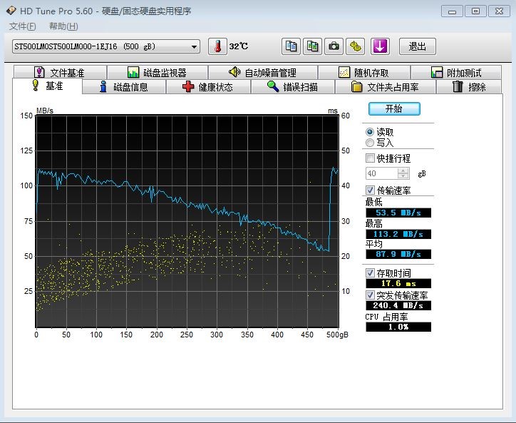 接下來(lái)我們分別用HD Tune Pro和Crystal Disk Mark兩款軟件來(lái)測(cè)試希捷500GB SSHD的具體性能是怎樣的,我們會(huì)連續(xù)進(jìn)行幾次測(cè)試來(lái)確定 SSHD的最大性能值,并且我們會(huì)放成績(jī)圖供大家參考。