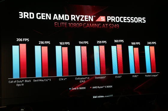 3600X為6核12線程,基礎頻率3.8GHz,睿頻頻率4.4GHz,擁有35MB三級緩存(AMD非常針對性地將其稱為游戲緩存),TDP 95W。在AMD公布的數據上看,3600X在1080P分辨率下的游戲表現與i5-9600K難分高低,而由于線程數量和制程、架構的原因,在多媒體和能效方面明顯勝出。
