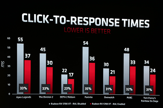 最后,還有一項RADEON ANTI-LAG技術,可降低鼠標、鍵盤等外設的輸入延遲,現場給出了一組實測數據,開啟后在多款游戲中都有明顯的效果。
