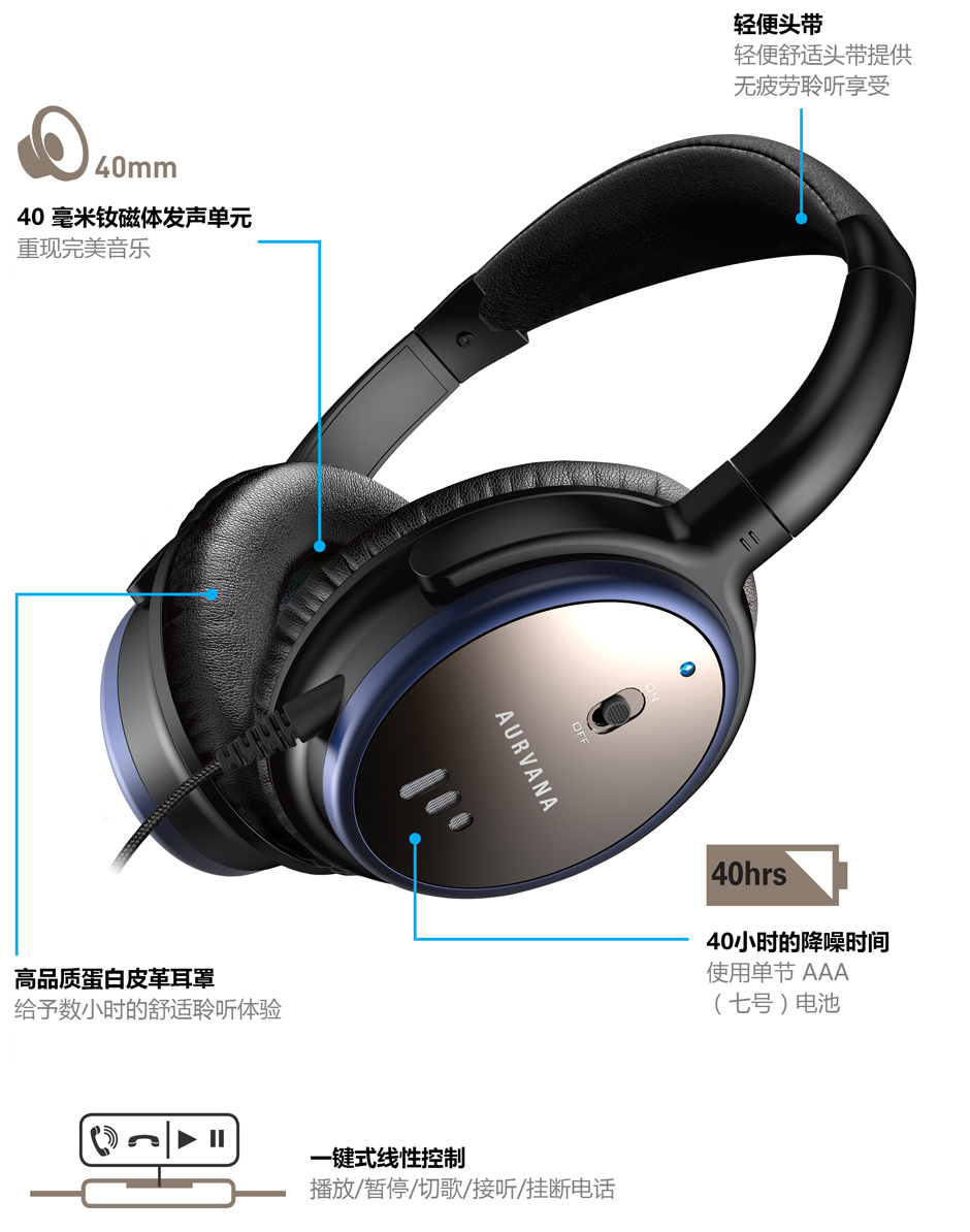 Aurvana ANC還支持線控,可以控制音樂播放以及接聽,掛斷電話,非常方便,40mm的發聲單元是音質的有力保保障。是一款非??梢詣偃胃鞣N環境的耳機產品。