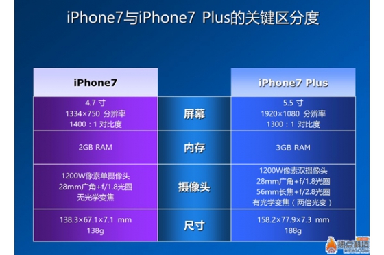 但實際上,iPhone內部還有好幾個很明顯的技術規格差異,從而使得普通版和Plus版的區分度更加鮮明,各自的特點也更加顯著,尤其是iPhone7這一代,差異就更大。