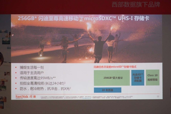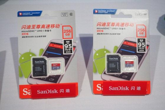 256GB 的 Micro-SDXC 存儲卡是此次發布會的另一亮點。產品擁有最高可達 95 MB/s 的傳輸速度,同時還具有一定的防水、耐寒、抗熱、防震、防 X 射線性能,售價達 1399 元人民幣。