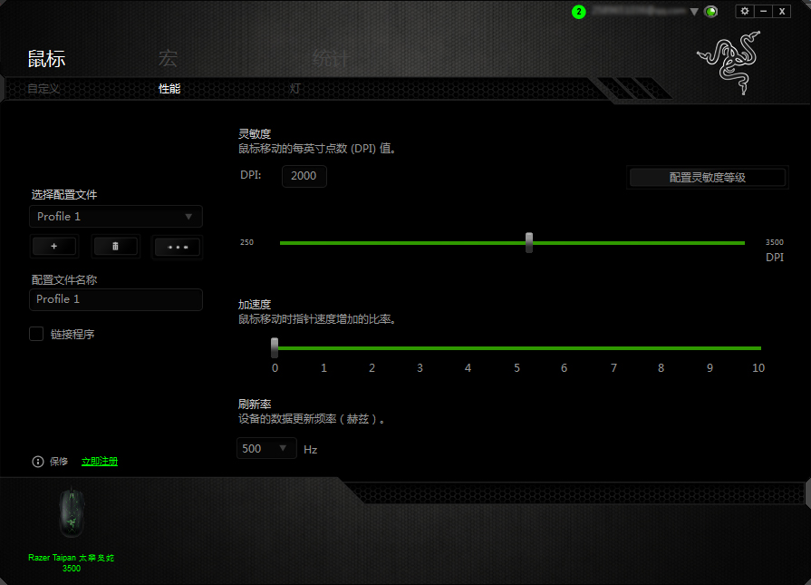 還可以設(shè)置鼠標(biāo)的靈敏度,最低250最高3500,每250為一檔