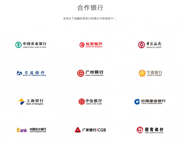 迄今為止,已經有19家中國銀行支持Apple Pay,分別為北京銀行、交通銀行、寧波銀行和華夏銀行、中國農業銀行、中國銀行、廣州銀行、上海銀行、中國建設銀行、光大銀行、廣發銀行、興業銀行、中信銀行、招商銀行、中國民生銀行、中國工商銀行、平安銀行、中國郵政儲蓄銀行、浦發銀行,預計未來會支持更多中國銀行。
