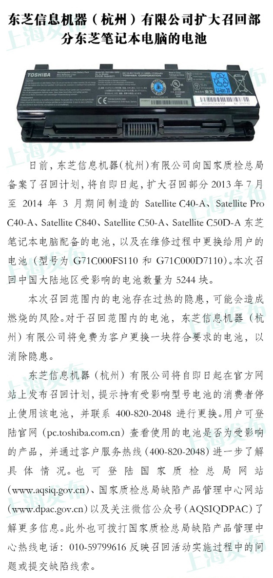 繼各家手機廠商電池接連出問題后,如今筆記本電腦電池也發生了問題。據國家質檢總局消息,東芝信息機器(杭州)有限公司自即日起召回2013.7-2014.3制造的多款型號的東芝筆記本電腦配備的電池,以及在維修過程中更換給用戶的電池。