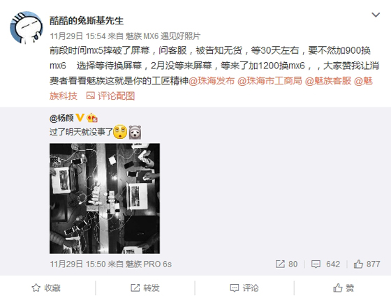 為了給今天的演唱會造勢,魅族楊顏這幾天也是頻繁發微博吸引網友的眼球。小編昨晚隨意瞄了一眼楊顏微博下面的評論,發現其中有一個微博用戶在投訴魅族的售后問題。微博用戶“酷酷的兔斯基先生”買了魅族MX5手機,摔壞了屏幕去售后維修,但售后告知他廠家目前沒有MX5的屏幕可用于維修更換,你可以選擇用這臺損壞的MX5另加900元更換一臺MX6手機,或者等待廠家的屏幕到貨通知。這位微博網友就這樣傻傻的等了2個月,但并沒有等來MX5屏幕的到貨通知,而是被告知,現在如果想用這臺損壞的MX5折價更換MX6,需要再補1200元了。該微博網友在微博上多次@魅族官方的賬號,但魅族官方沒有回復他。根據國家的三包法規定,手機生產廠家需要在手機停產后的2年內保證該款手機的維修物料的供應,而現在魅族對上市才僅僅1年的手機就不提供維修物料,這簡直是在公然藐視國家的法律規定。