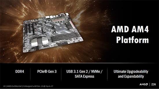 AMD Ryzen處理器基于“Zen”架構(gòu),核心代號“Summit Ridge”。規(guī)格方面有:8核心16線程,3.4 GHz+的主頻,4MB二級緩存,16MB三級緩存,TDP 95W。伴隨著Ryzen,AMD推出了全新的AM4主板平臺,該平臺支持DDR4內(nèi)存,PCle三代傳輸協(xié)議,USB3.1二代,NVMe,SATA-E接口。