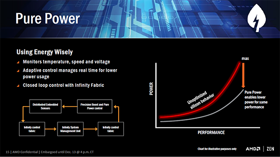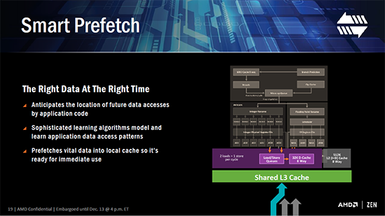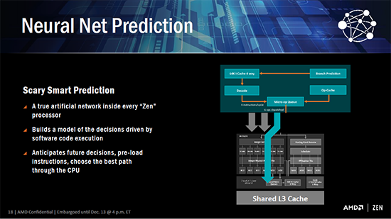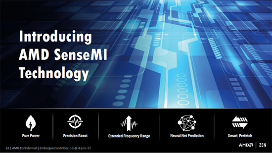 AMD官方宣稱,Ryzen處理器的性能相對于前代旗艦產(chǎn)品性能提升在40%以上,這都得益于Ryzen處理器內(nèi)嵌的SenseMI技術(shù)。SenseMI技術(shù)融合了精確功耗控制(Pure Power),精準(zhǔn)智能超頻(Precision Boost),擴展頻率范圍(Extended Frequency Range-XFR),神經(jīng)網(wǎng)絡(luò)預(yù)測(Neural Net Prediction),智能預(yù)取(Smart Prefetch)五個組件架構(gòu)。