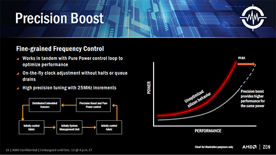 精準(zhǔn)智能超頻(Precision Boost)- 智能邏輯電路可監(jiān)控集成的傳感器,并以低至25MHz的增幅優(yōu)化時鐘頻率,每秒高達(dá)千次。