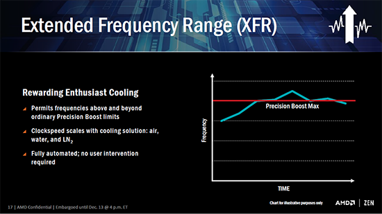 擴展頻率范圍(Extended Frequency Range-XFR)- 當(dāng)系統(tǒng)感測到散熱能力提升時,XFR提升精準(zhǔn)智能超頻(Precision Boost)頻率,以提高性能。