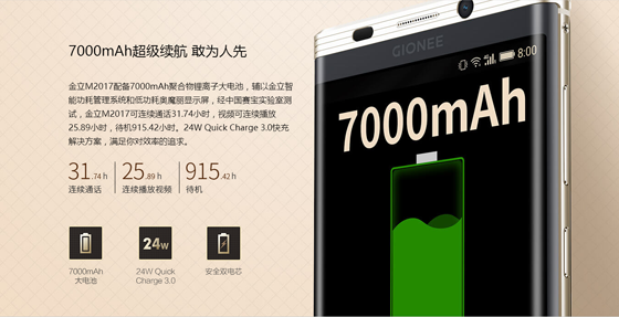 下面上干貨。不難看出,在一堆可謂是頂級的配置中,驍龍653處理器確實讓人大跌眼鏡。但高達7000mAh的電池和24W快充,也讓人眼前一亮。電池續航一直是用戶的痛點,而解決這一問題的兩個途徑,一是快速充電,二是加大電池容量。但現如今很多廠商都在快沖上狠下功夫,而寧可在電池容量上稍作犧牲,原因無非是大電池會極大地增加手機的厚度和重量。所以,金立M2017采用的7000mAh的大電池也給這款手機帶來了10.78mm的厚度和238g的重量。