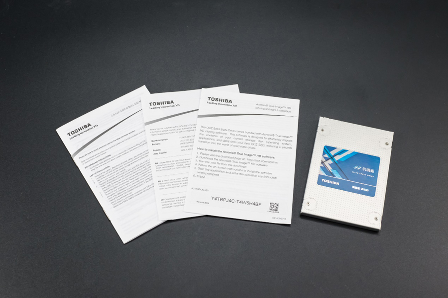 打開包裝,拿掉塑料保護(hù)殼,里面只有一塊SSD和三小本紙質(zhì)說明書及手冊,由于是非正式上市版本,說明書及手冊是全英文的,大陸正式上市以后說明書及手冊應(yīng)該會是中文的,這點(diǎn)大家不用擔(dān)心。