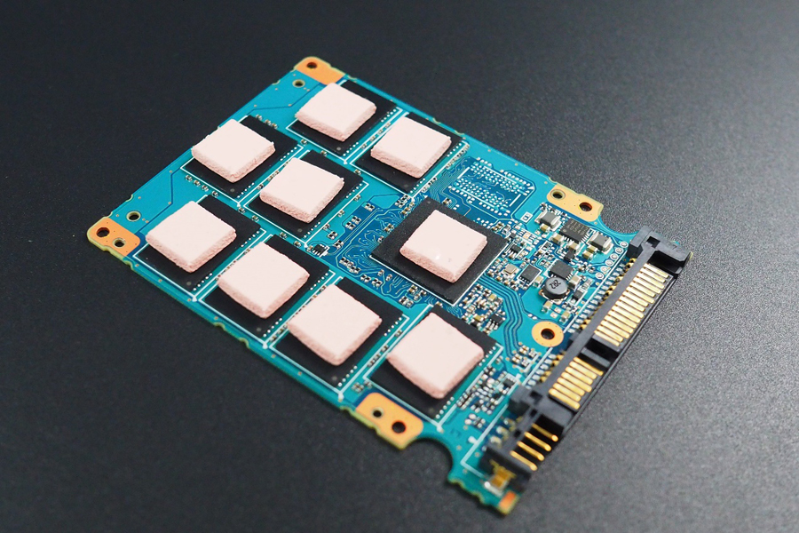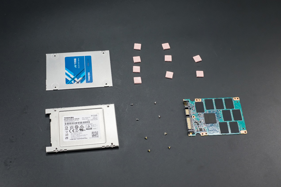 把饑餓鯊VX500拆解后,我們看到這款512GB的SSD是由單面8塊閃存芯片和1塊主控芯片組成的,閃存芯片每塊512Gbit的容量,8塊正好是512GB(8bit=1Byte)。8塊閃存芯片和主控芯片上面都貼了一塊防震保護(hù)的泡沫海綿。
