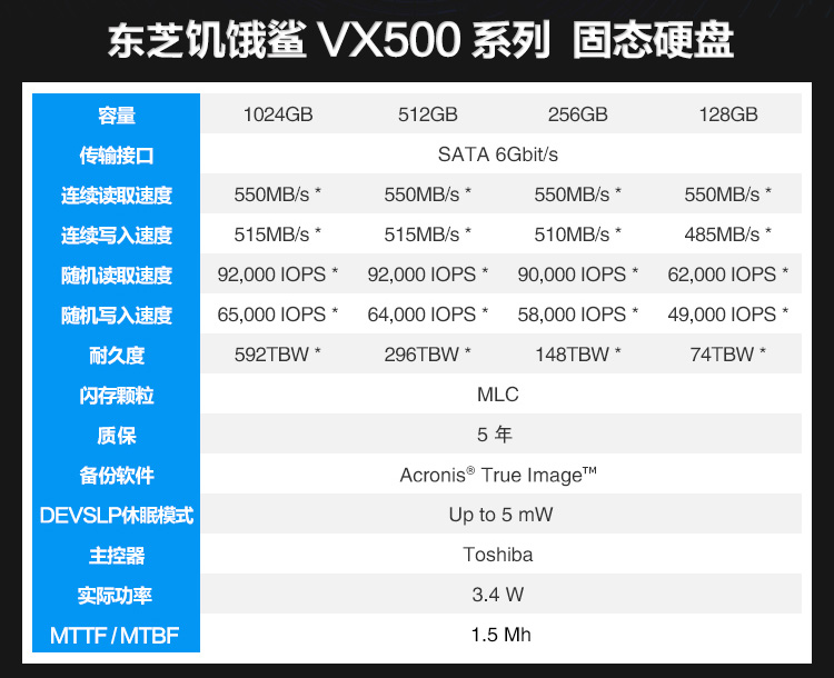現(xiàn)在的東芝饑餓鯊就是以前大家熟悉的OCZ,OCZ是最早生產(chǎn)SSD固態(tài)硬盤的廠家之一,在消費(fèi)市場上以穩(wěn)定的性能和適中的價格在SSD領(lǐng)域享有不錯的聲譽(yù)。OCZ曾為固態(tài)硬盤的普及做出了重要貢獻(xiàn),后來被閃存界的大佬東芝收購。東芝擁有強(qiáng)大的NAND閃存,但是在SSD領(lǐng)域缺乏很好的主控芯片,而OCZ此前受困于閃存供應(yīng)但在主控方面小有成就,如今OCZ與東芝的結(jié)合也算是優(yōu)勢互補(bǔ),強(qiáng)強(qiáng)聯(lián)合了。東芝收購OCZ后,在中國大陸市場將原來的OCZ系列產(chǎn)品改名為饑餓鯊,并推出了兩款主打性價比的入門級SSD產(chǎn)品 TL100和TR150。這兩款饑餓鯊SSD價格低廉,但是性能和耐久度比較一般,相對比較適合追求價格的用戶。為了滿足更多主流用戶的需求,現(xiàn)在東芝推出了采用自家15nm MLC閃存顆粒的饑餓鯊VX500系列SSD,相對于TLC顆粒,MLC顆粒價格更高但是穩(wěn)定性和耐久度也更好。饑餓鯊VX500系列有128GB,256GB,512GB,1TB四個規(guī)格容量,目前小編手里拿到了一款512GB容量版本,針對這款SSD,性能到底如何呢?我們一起來看看。