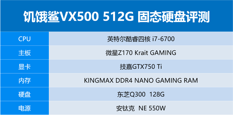 接下來用軟件測試一下饑餓鯊VX500 512GB的實(shí)際性能,本次測試的平臺為: