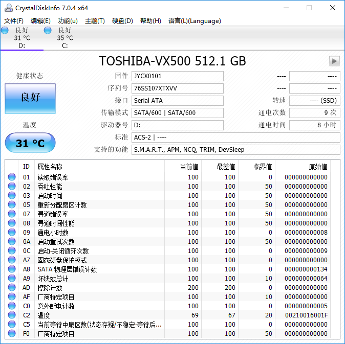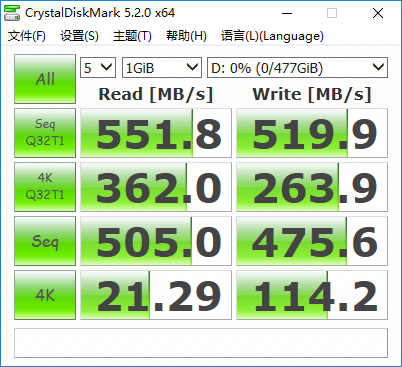 CrystalDiskMark顯示的饑餓鯊VX500 512GB固件版本為JYCX0101。測試1GB大小文件的連續(xù)讀取速度為551.8MB/s,連續(xù)寫入速度519.9MB/s。