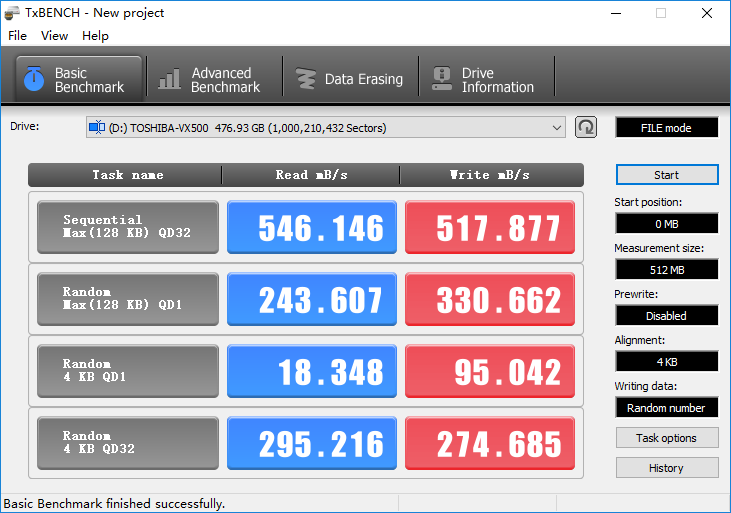 TxBENCH測試的連續(xù)讀取速度為546.1MB/s,連續(xù)寫入速度517.8MB/s,和前兩款測試軟件得出的數(shù)據(jù)沒什么區(qū)別。