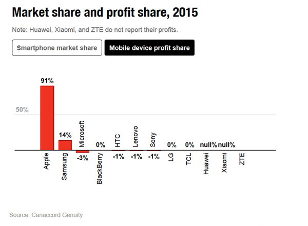 一直以來(lái),蘋(píng)果公司就以其強(qiáng)大的“吸金”能力讓其它眾多手機(jī)廠商羨慕嫉妒恨,而最近一份來(lái)自《財(cái)富》雜志的數(shù)據(jù)顯示,2015年的蘋(píng)果吸金能力依然令人瞠目結(jié)舌。根據(jù)數(shù)據(jù),蘋(píng)果又一次傲居群雄,獨(dú)占了智能手機(jī)市場(chǎng)91%的利潤(rùn)。