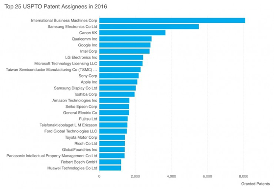 外媒公布的專利榜單中顯示, IBM在剛剛過去的2016年里,獲得了8088項美國專利,連續24年蟬聯榜首,成為當年獲得美國專利數量最多的公司。