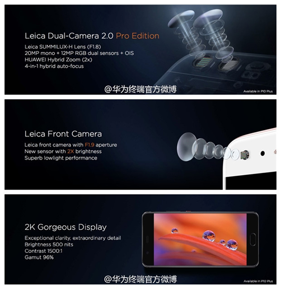 P10 Plus則采用了5.5英寸2K屏,搭載麒麟960處理器,內置6GB內存和128/256GB機身存儲空間,攝像頭方面搭載徠卡SUMMILUX高端鏡頭,擁有F1.8大光圈。