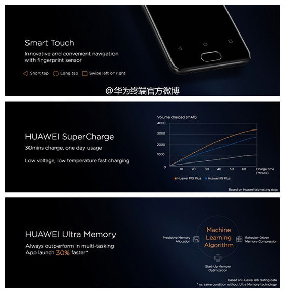 華為P10/P10 Plus采用了前置一體化紋傳感器,該傳感器隱藏于前面板玻璃下,識別區域的玻璃面板上加工了一個凹槽以提示用戶解鎖時手指應該放置的區域,類似于小米5S的指紋模塊設計。電池方面P10/P10 Plus分別配備了3200mAh和3750mAh的大電池,均支持華為SuperCharge低壓快充技術。同時,這兩款手機還采用了Ultra Memory銳存加速技術,提高內存的使用效率。
