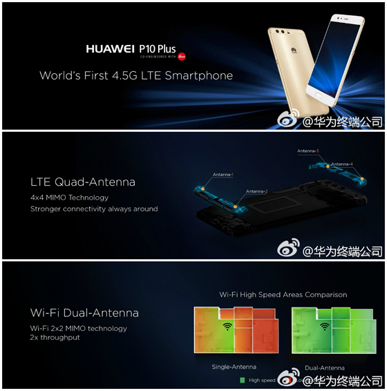 其中,華為P10 Plus采用Wi-Fi雙天線設計,有效提高網絡連接穩定性,而且采用LTE四天線設計(4x4 MIMO),是全球第一款支持4.5G網絡的手機,支持LTE CAT12高速網絡,可實現兩倍于普通4G手機的下載速度。