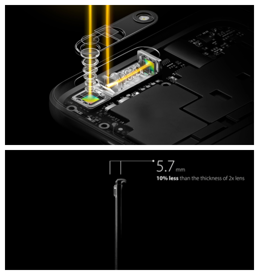 在MWC2017上,OPPO發布了一個十分巧妙的攝像頭變焦技術,它將潛望鏡式的鏡頭設計帶到了手機上。在這項技術的兩個攝像頭中,除了一個普通放置的CMOS和鏡頭模組外,還有一個橫置的潛望鏡式光學變焦模組,這使得受限于機身厚度的攝像頭模組空間在橫向上得到了延伸,從而使得這一套裝置可以實現5倍的無損變焦。最重要的是,整套裝置厚度僅為5.7mm,是目前市面上智能手機潛望式鏡頭中最薄的。