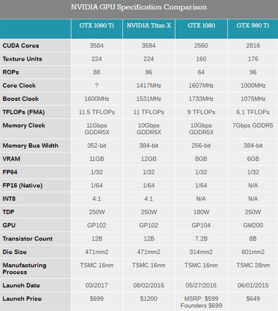 GTX 1080 Ti顯卡依然基于帕斯卡構(gòu)架,與TITAN X同為GP102核心,但位寬和顯存做了“罕見(jiàn)”的調(diào)整:GTX1080Ti的位寬為352bit(TITAN X為384bit),顯存則相應(yīng)為11GB GDDR5X。在存儲(chǔ)上,“11GB”這種數(shù)字確實(shí)是十分罕見(jiàn)。而ROPs數(shù)量為88個(gè)單元,略少于TITAN X的96個(gè)。外媒對(duì)幾款頂尖N卡參數(shù)作了總結(jié)比較: