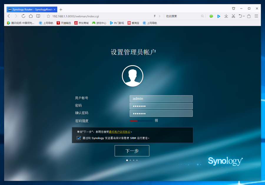 群暉RT1900ac在安裝上也是非常簡單的,在瀏覽器地址欄輸入192.168.1.1,開始即可進入管理員賬戶設置頁面,初次使用的時候是沒有密碼的,需要自己設置一個。