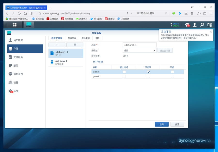群暉RT1900ac無線路由器上我插入了SD卡,和一個U盤,之后SD卡與U盤中的內容就可以通過路由器云輕松共享到所有連接到這臺路由器的主機。瀏覽相機中的SD卡,速度也非常的快。