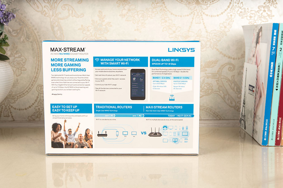 從背面的信息可見EA7500 V2支持Smart Wi-Fi中文版APP,此外使用了MU-MIMO(多用戶多入多出)技術,可在同一時間向多個設備分配高帶寬,保證了AP的總容量就被充分的利用了,提升了家庭中多個智能設備同時接入后的穩定性與速度。