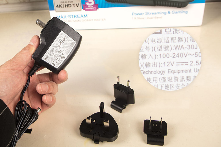 電源適配器采用100-240V寬電壓設計,有著更好的適應性可以有效地保證EA7500 V2的穩定運行,即便在電壓不穩定的情況下依然可靠。同時采用了可更換插頭設計,支持美、日、國標等多種插座。